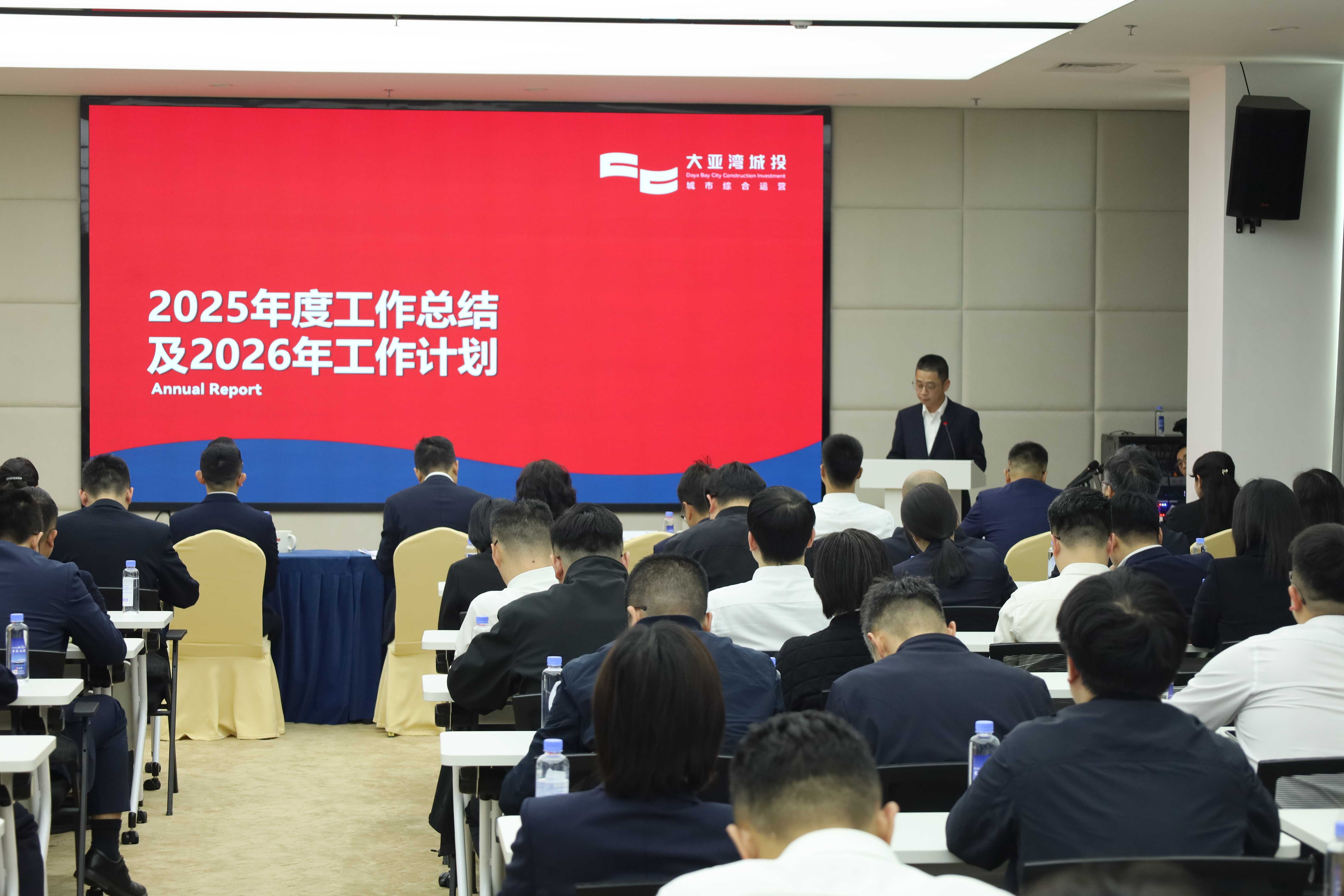 2026年2月12日下午,惠州大亚湾城市开发建设投资集团有限公司(以下简称“集团”)2025年度工作总结暨2026年工作部署大会顺利召开。大会主要任务:全面总结“十四五”时期工作成效,客观分析当前发展形势,系统谋划“十五五”发展思路,部署2026年重点工作任务,进一步统一思想、凝聚共识、真抓实干,奋力推动集团在新征程上实现更高质量、更可持续、更加安全的发展。集团党总支书记、董事长江益凡出席会议并讲话,集团党总支委员、副总经理陈强民主持会议,集团本部全体员工、二级企业中层及以上人员、三级企业主要负责人及受表彰人员共100余人齐聚港湾大厦,共同回顾年度工作、谋划未来发展。