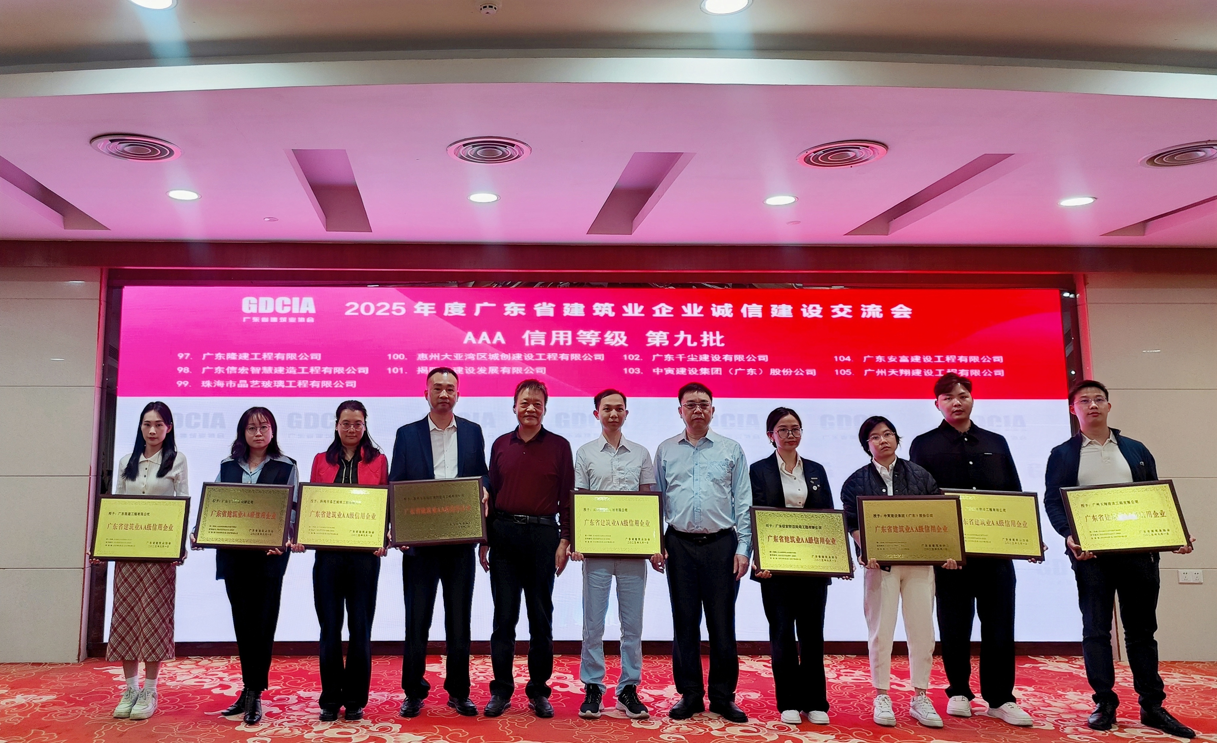 近日,广东省建筑业协会公布了“2025年度广东省建筑业AAA级、AA级信用企业”名单,并于2025年10月24日对信用企业进行现场授牌颁奖仪式。城创公司凭借多年来的努力,在诚信建设、合同履约等方面得到行政主管部门、行业协会的认可,荣获“2025年度广东省建筑业AA级信用企业”称号。